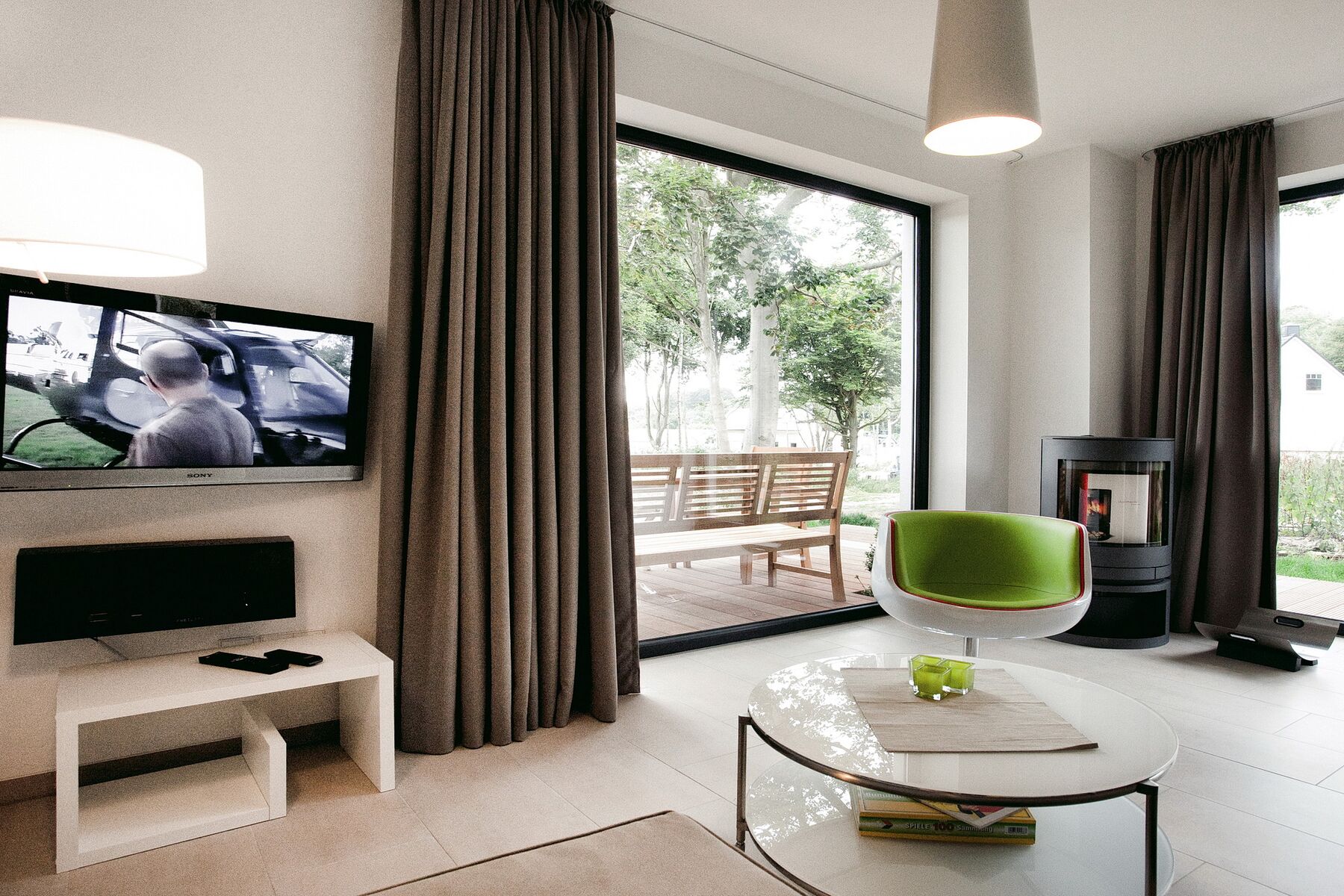 Im Erdgeschoss befindet sich das geräumige Wohn- und Esszimmer mit Kaminofen, Couchecke, großformatigem Flachbild-TV und vorgelagerter Terrasse. Hier können Sie in der warmen Jahreszeit ganz wunderbar den Abend draußen verbringen und Köstlichkeiten vom Grill genießen. In der hochwertigen Markenküche finden Sie alle technischen Geräte und Utensilien, um sich selbst zu verpflegen. Und für den Fall, dass Sie keine kostbare Urlaubszeit mit Kochen verbringen möchten, bietet das Ostseebad Sellin vielfältige Restaurants, in denen Sie sich kulinarisch bewirten lassen können.